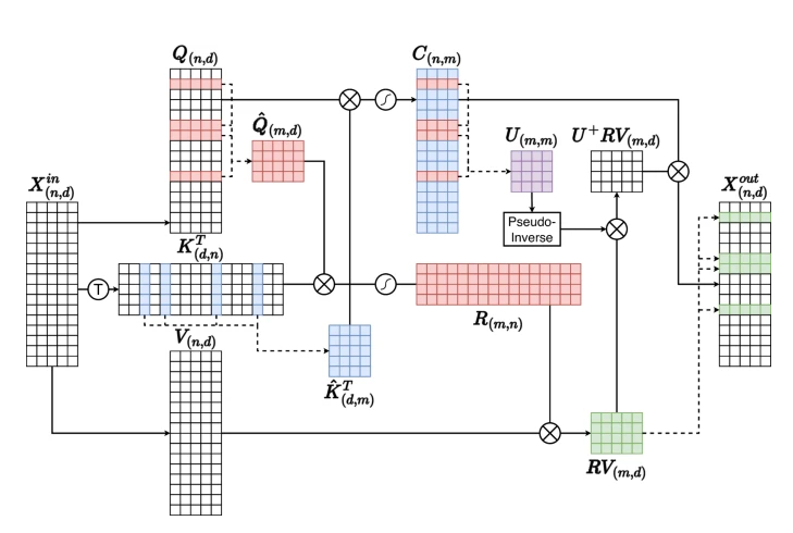 “In this paper, we propose a novel linear approximation method for Self-Attention inspired by the CUR approximation method. This method, proposed in two versions (one leveraging FlashAttention), is conceived as a drop-in replacement for standard Self-Attention with weights compatibility..”
