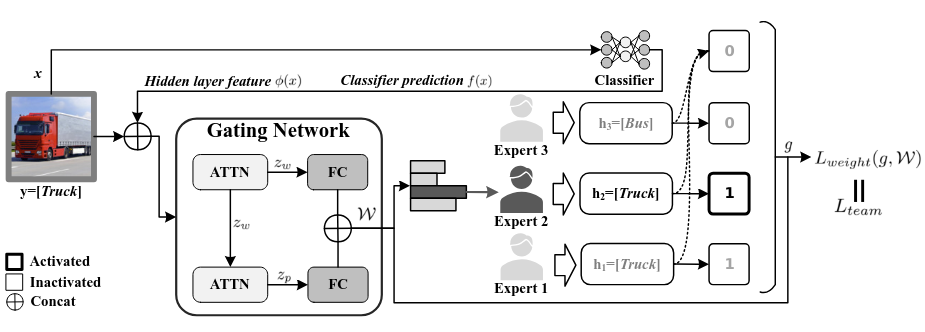 “we propose the Complementarity-Enhanced Mixture of Human-AI Teams (CE-MoHAIT) framework. Our approach decomposes the gating network’s output into two branches, i.e., a human expert branch and a classifier branch, thereby explicitly modeling the complementarity between human and AI capabilities.