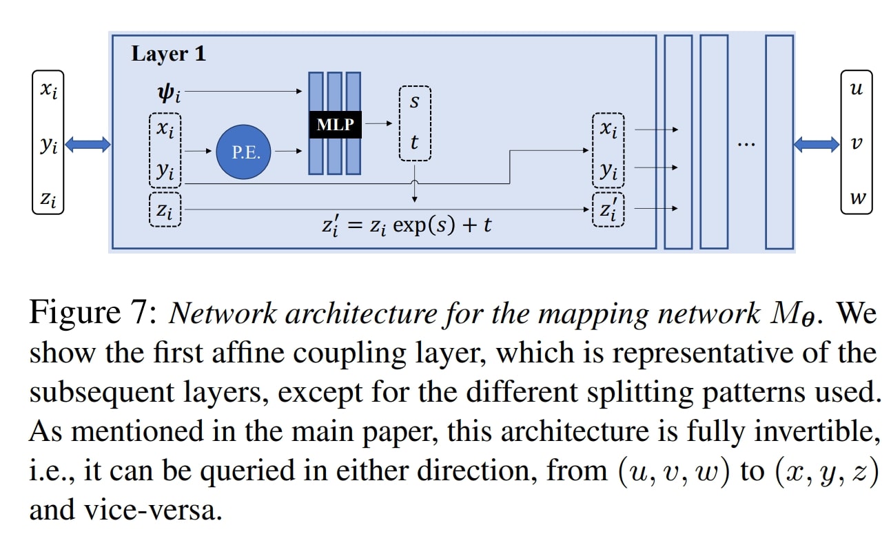 \[x_j = \mathcal{T}^{-1}_j \circ \mathcal{T}_i(x_i)\]The bijective function \(\mathcal{T}\) is implemented with an invertible neural network (Real-NVP2). The conditioning on the time index is done with a frame latent code \(\psi_i\) such that one neural network can parametrize all the bijections: \(\mathcal{T}_i(\cdot) = M_\theta(\cdot;\psi_i)\). The latent code is computed with a separate MLP.