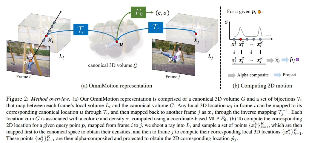 To compute the motion of a 2D point (i.e., its position in another frame), it is first “lifted” into 3D by sampling along a ray. The 3D point is mapped into the canonical volume and unmapped back to a different frame, where it is projected back to 2D.