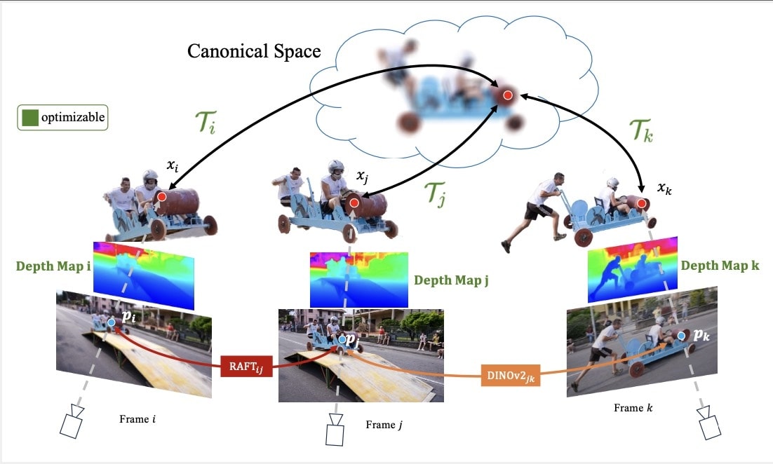 - In addition to RAFT, DinoV2 is used to generate more long-term noisy estimates for the motion.
