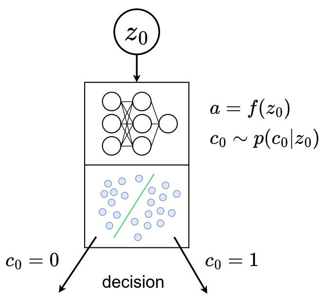 - Finally, the variational distributions of the decisions \(q(c_i \mid x)\) are defined as