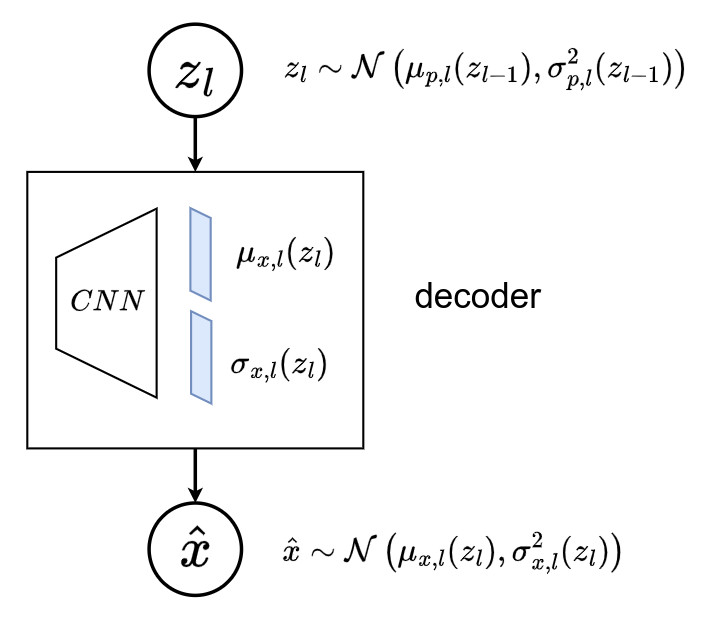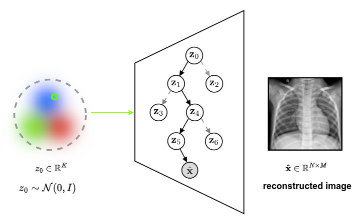 ➔ \(p_{\theta}(z_{\mathcal{P}_l}, \mathcal{P}_l) = p(z_0) \, \prod_{i\in \mathcal{P}_l \backslash \{0\}}{\, \, \underbrace{p(c_{pa(i) \to i} \mid z_{pa(i)})}_{\text{path}} \, \cdot \, \underbrace{p(z_i \mid z_{pa(i)})}_{\text{latent variable}}}\) - Finally, \(x\) is sampled from a distribution that is conditionned on the selected leaf \(p_{\theta}(x \mid z_{\mathcal{P}_l}, \mathcal{P}_l) = \mathcal{N}(\mu_{x,l}(z_l), \sigma_{x,l}^2(z_l))\), where \(\{ \mu_{x,l} , \sigma_{x,l} \mid l \in \mathbb{L}\}\) are functions parametrized by leaf-specific neural networks defined as decoders