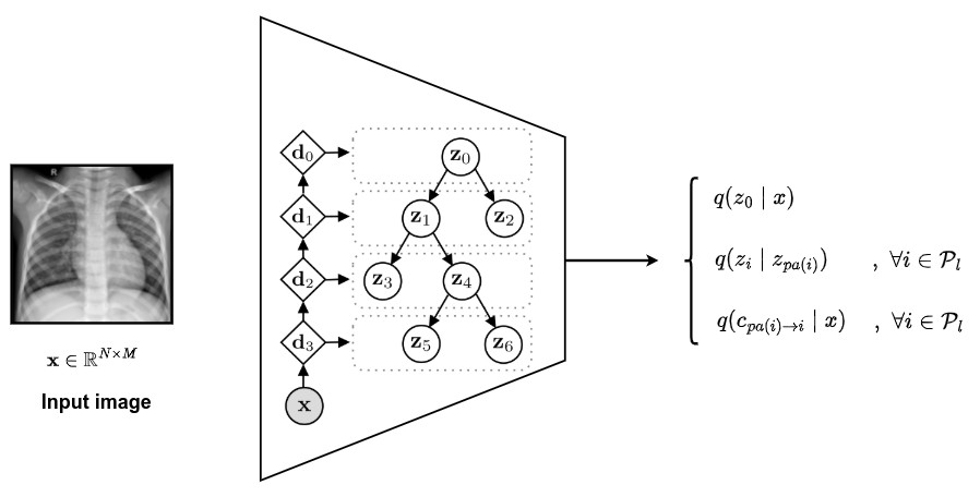 ➔ \(q(z_{\mathcal{P}_l}, \mathcal{P}_l \mid x) = q(z_0 \mid x) \, \prod_{i\in \mathcal{P}_l \backslash \{0\}}{\, \, \underbrace{q(c_{pa(i) \to i} \mid x)}_{\text{path}} \, \cdot \, \underbrace{q(z_i \mid z_{pa(i)})}_{\text{latent variable}}}\) - The authors used the work of Sonderby et al. to compute the variational probability distribution of the latent embeddings \(q(z_0 \mid x)\) and \(q(z_i \mid z_{pa(i)})\)