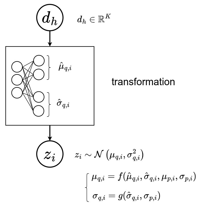 - The latent embedding of the selected child, e.g. \(z_1\), is then sampled from a Gaussian distribution \(z_1 \sim \mathcal{N}\left( \mu_{p,1}(z_0), \sigma^2_{p,1}(z_0) \right)\), where \(\{ \mu_{p,i}, \sigma_{p,i} \, \mid i \in \mathbb{V} \, \backslash \, \{0\} \}\) are functions parametrized by neural networks defined as transformations.