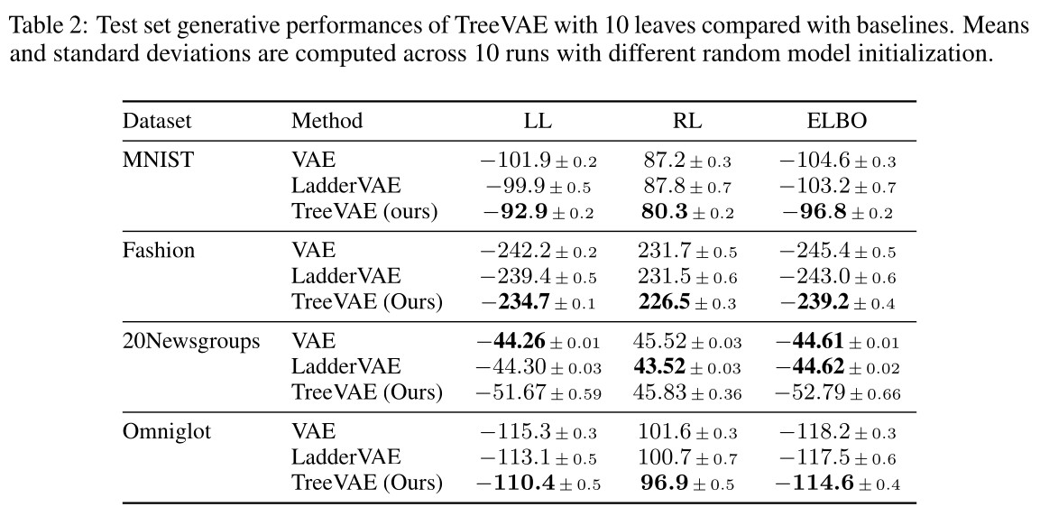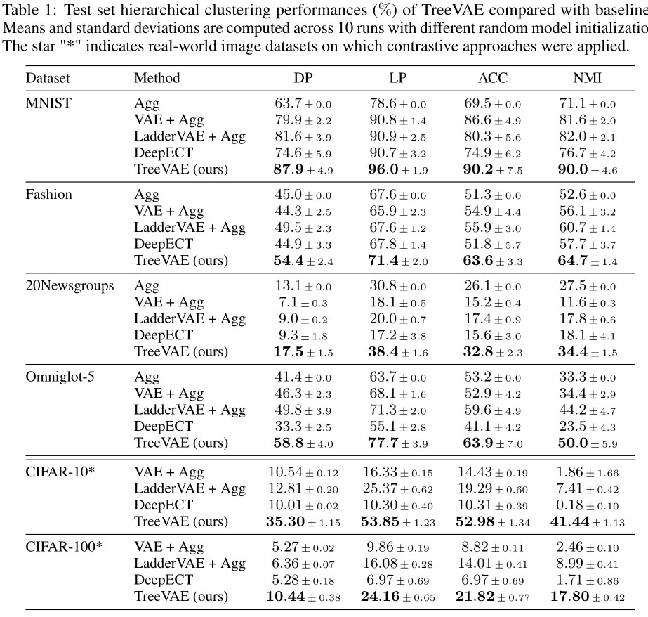 - Assessement of the hierarchical clustering performance by computing dendrogram purity (DP) and leaf purity (LP), , as defined by Kobren et al., and the more standard clustering metrics: accuracy (ACC) and normalized mutual information (NMI), by setting the number of leaves for TreeVAE and for the baselines to the true number of clusters