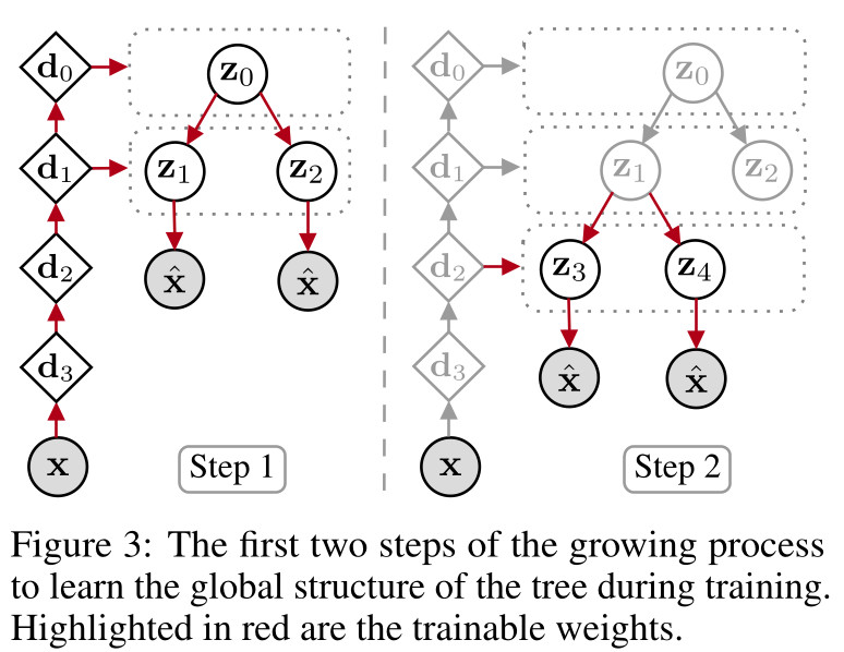 - The sub-tree composed of the new leaves and the parent node is then trained for \(N_t\) epochs by freezing the weights of the rest of the model and by optimizing the ELBO. At this stage, the sub-tree is trained using only the subset of data that have a high probability (higher than a threshold) of being assigned to the parent node
