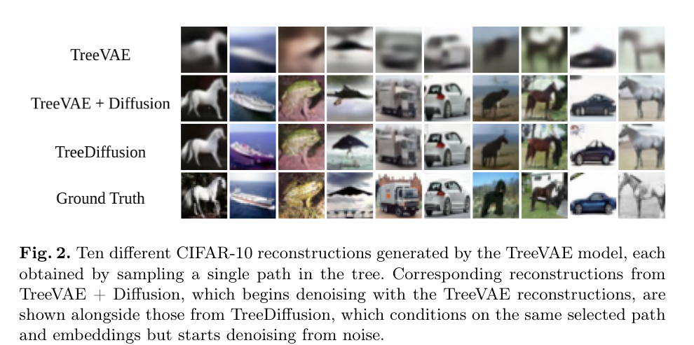 TreeVAE + Diffusion model begins denoising from TreeVAE reconstructions, thereby making it highly dependent on the reconstruction quality provided by TreeVAE.