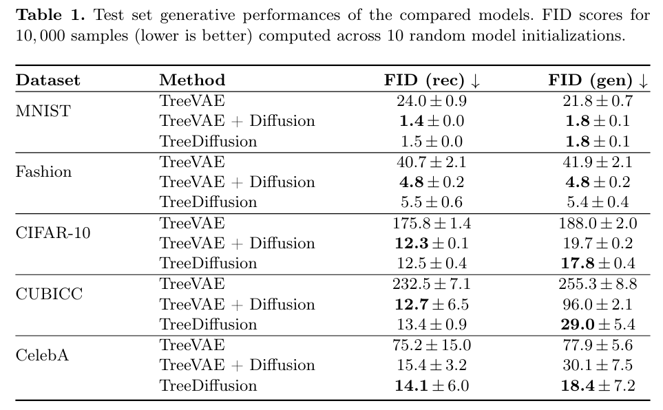 Note that the first row in the table represents the TreeVAE + Diffusion model from the previous experiments, whereas the last row corresponds to the proposed TreeDiffusion method