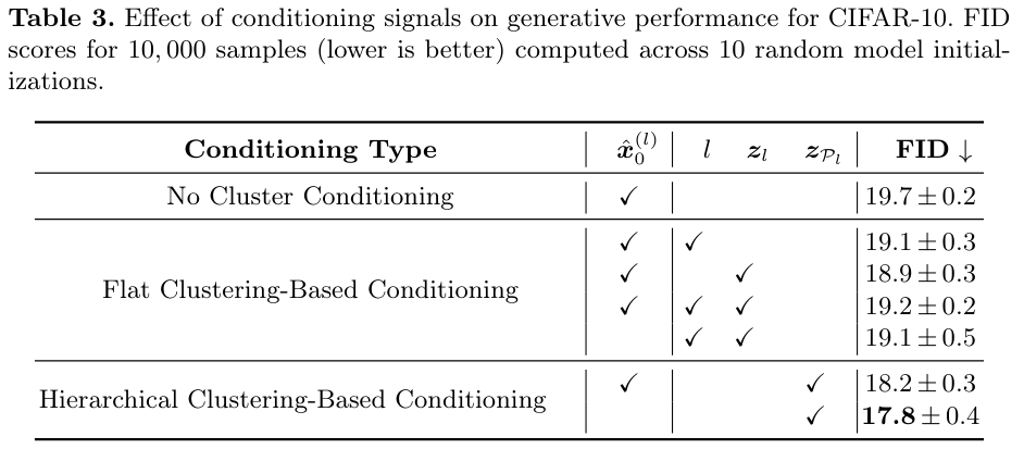 - Conditioning on hierarchical representations improves cluster-specific generative quality